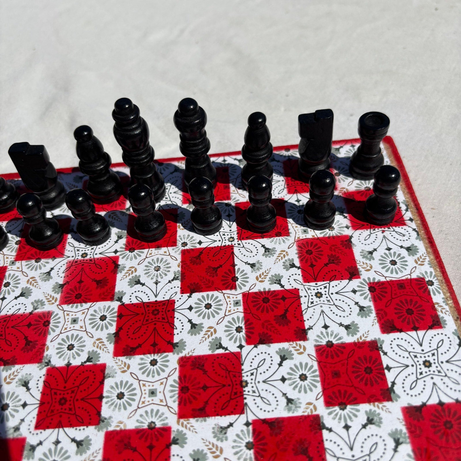 Introducing our exclusive Handcrafted Wooden Chess Set, meticulously designed with precision and care. Measuring 8 inches by 8 inches, this chess set features a beautifully painted particle board layered with a sheet of scrapbook paper board that doubles as a work of art. Each set is a unique, one-of-a-kind creation, crafted by hand to ensure that no two sets are alike. Elevate your gaming experience with this exceptional chess set that combines vibrant design with the touch of artisan craftsmanship. This chess board comes with chess pieces and is handcrafted as a one of one