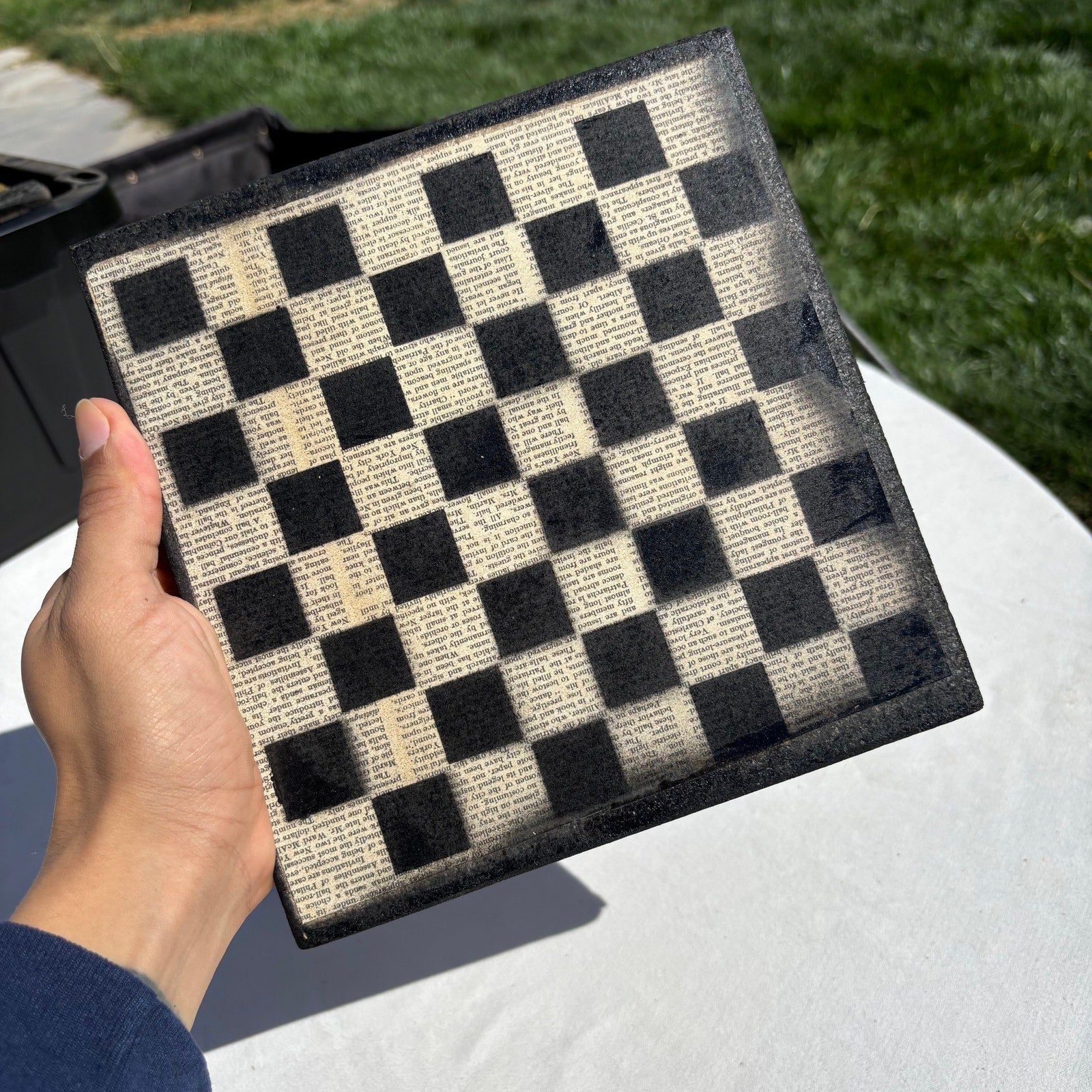 Introducing our exclusive Handcrafted Wooden Chess Set, meticulously designed with precision and care. Measuring 8 inches by 8 inches, this chess set features a beautifully painted particle board layered with a sheet of scrapbook paper board that doubles as a work of art. Each set is a unique, one-of-a-kind creation, crafted by hand to ensure that no two sets are alike. Elevate your gaming experience with this exceptional chess set that combines vibrant design with the touch of artisan craftsmanship. This chess board comes with chess pieces and is handcrafted as a one of one