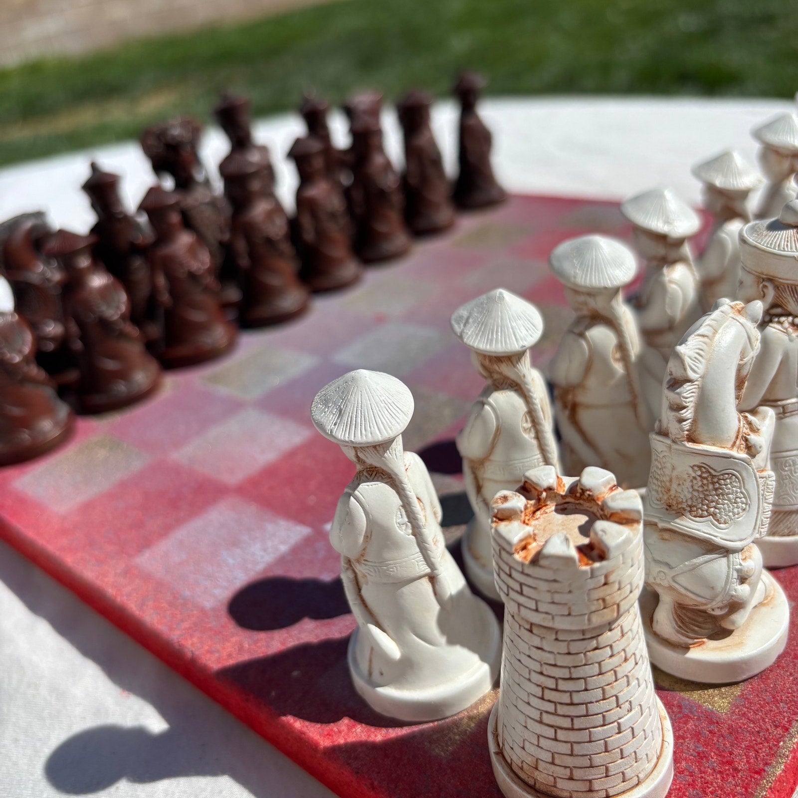 This set is not just a game; it's a work of art, perfect for collectors and chess enthusiasts alike. The attention to detail and craftsmanship makes it a standout piece. Whether you're looking for a beautiful display item or a functional chess set for play, this hand-painted creation is sure to impress. The unique design and quality materials make it a valuable addition to any collection.