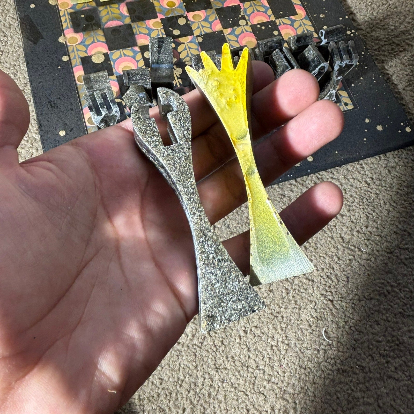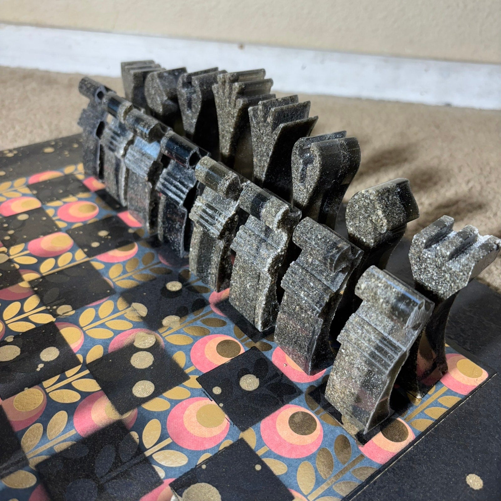 This unique chess set is a one-of-a-kind creation, perfect for chess enthusiasts and collectors! The chess pieces are handmade from resin and mixed with sand rock, giving them a substantial and satisfying weight.