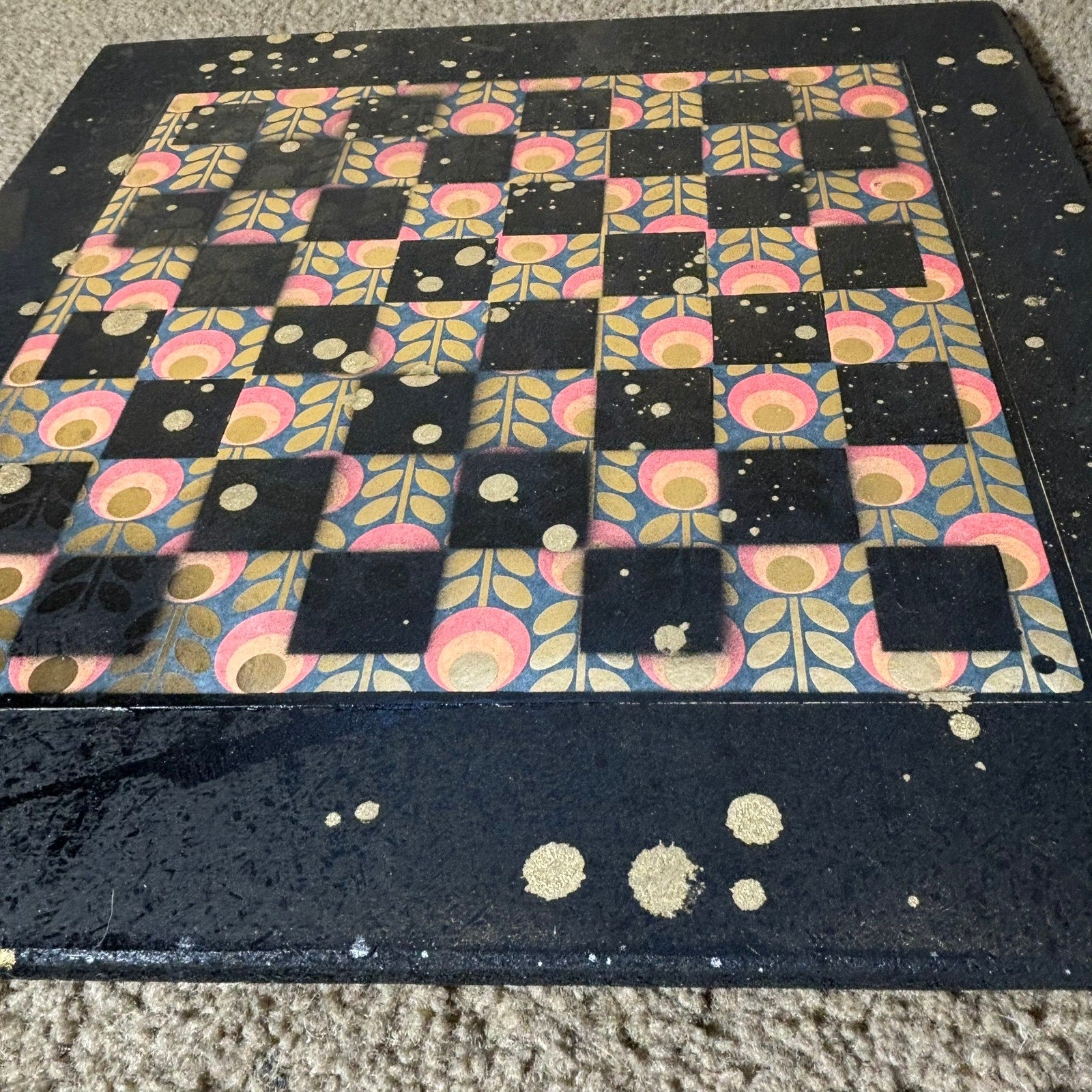 The chessboard is crafted from a 16x16 inch particle board, featuring a 12x12 inch scrapbook paper playing area. Both the board and squares are hand-painted with care, making each set truly unique. Add a touch of artistry to your game night with this beautiful chess set!