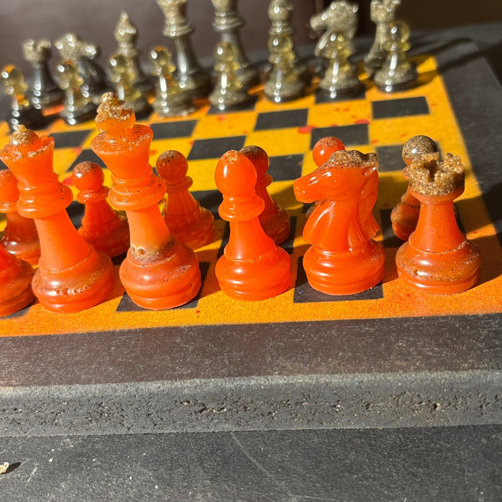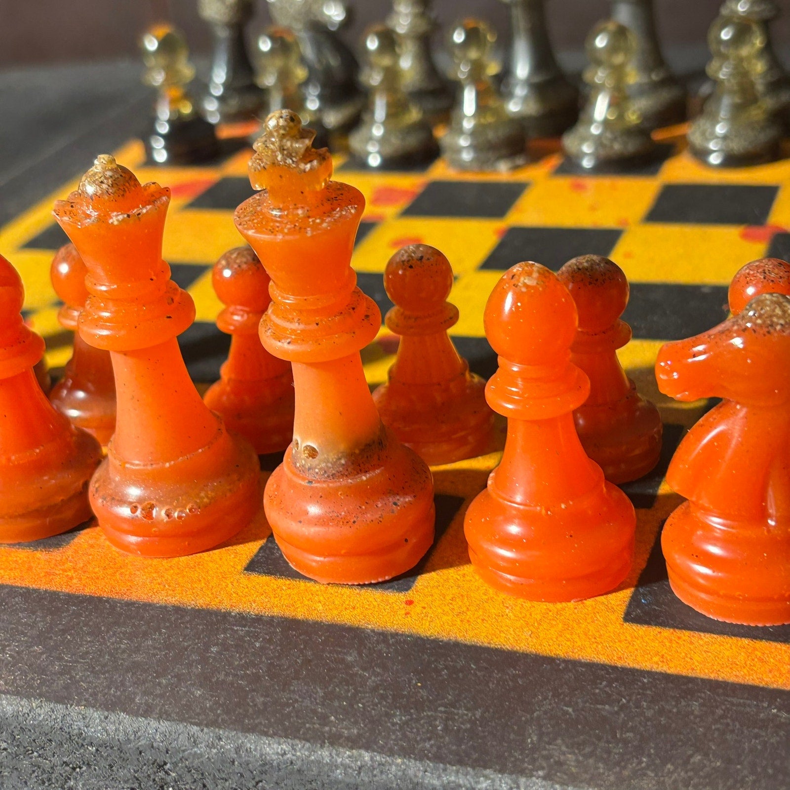 *** PLEASE READ: The resin pieces that have clear transparent parts will slowly turn royal amber as time goes on (Clear see through resin turn amber with time). Most of the sets are solid or colored so there is no need to expect a change at all, but some have clear transparent bottoms that will turn amber. I write this because some of our chess sets may not sell for a year or two and the photos are taken when the item is listed online. Meaning the photos will have slight difference. Rest assured, the amber is beautiful and vintage!