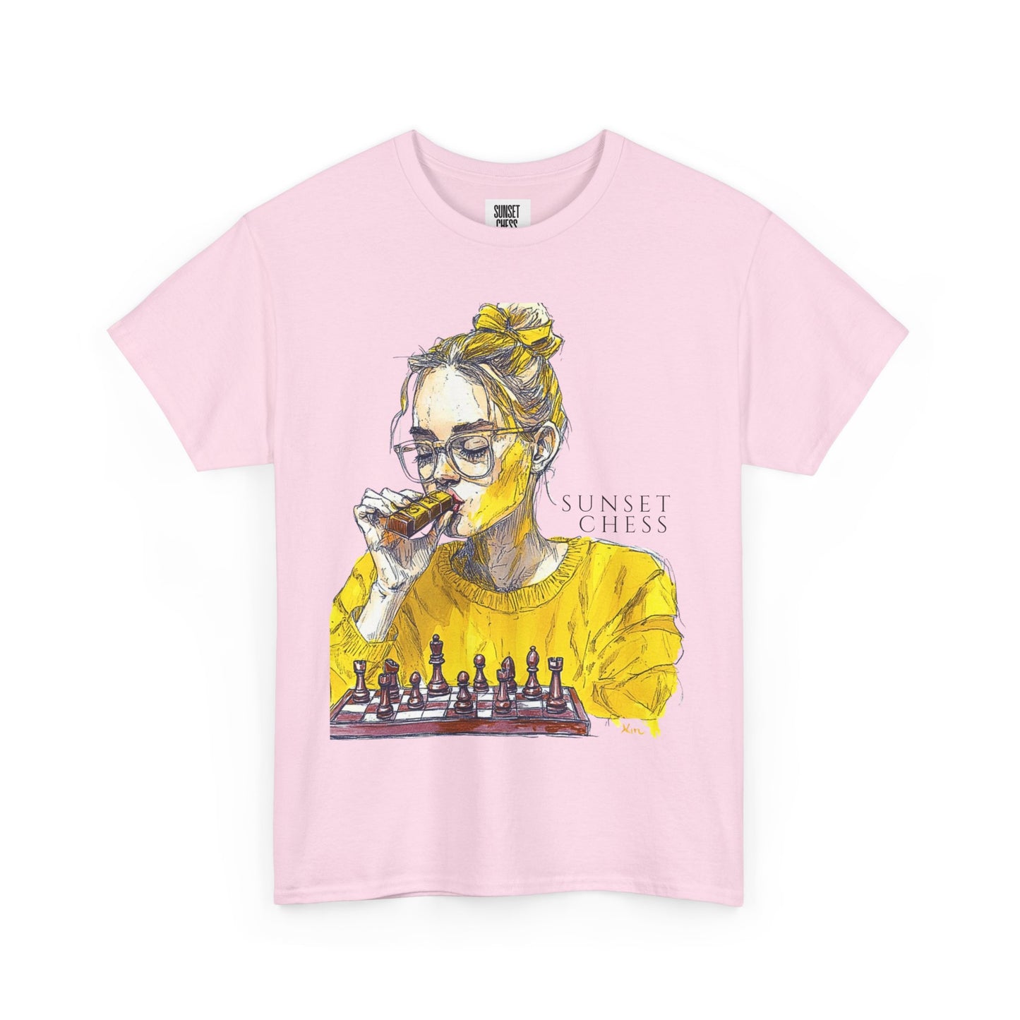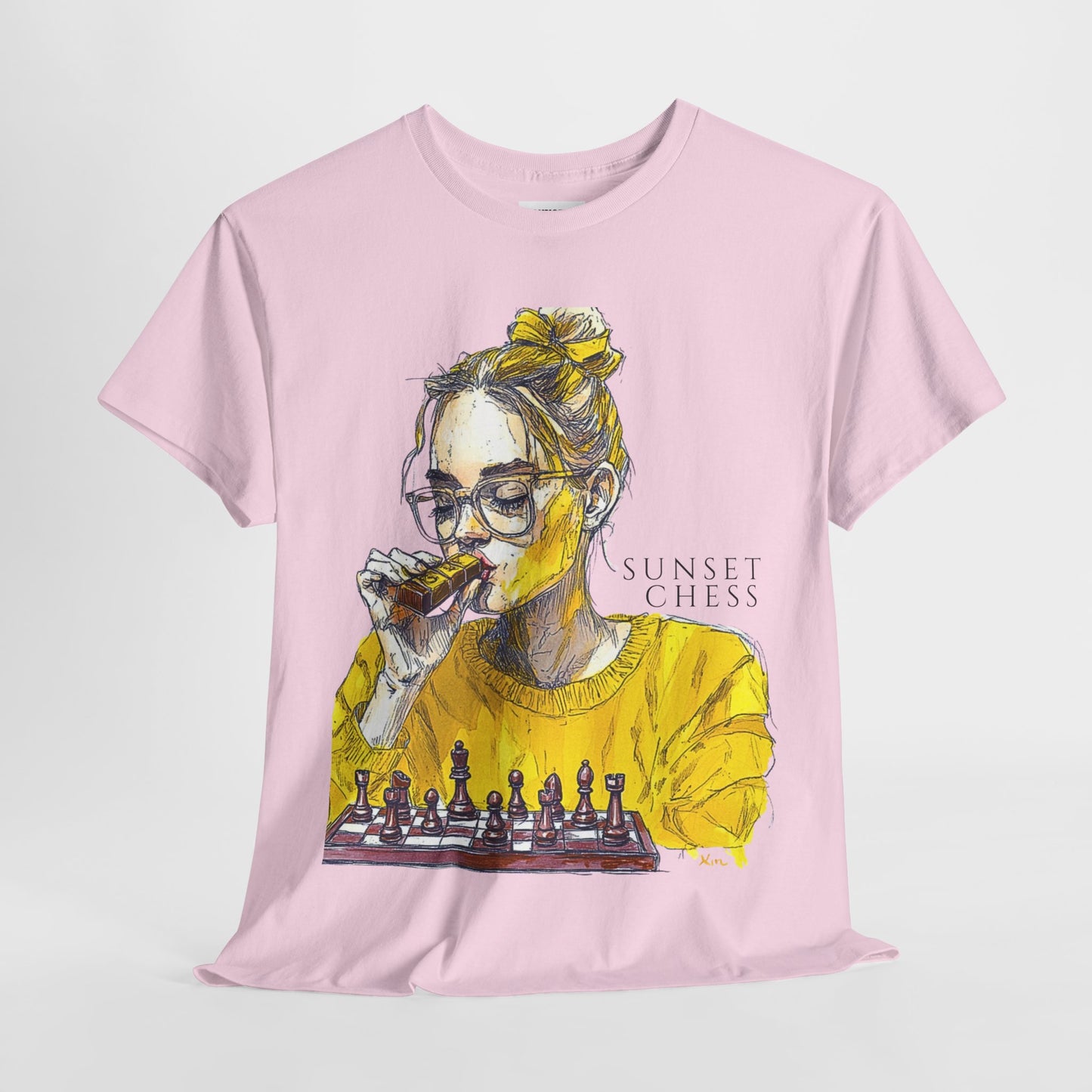 Yellow Woman Playing Chess - Pink Edition - Unisex Heavy Cotton Tee